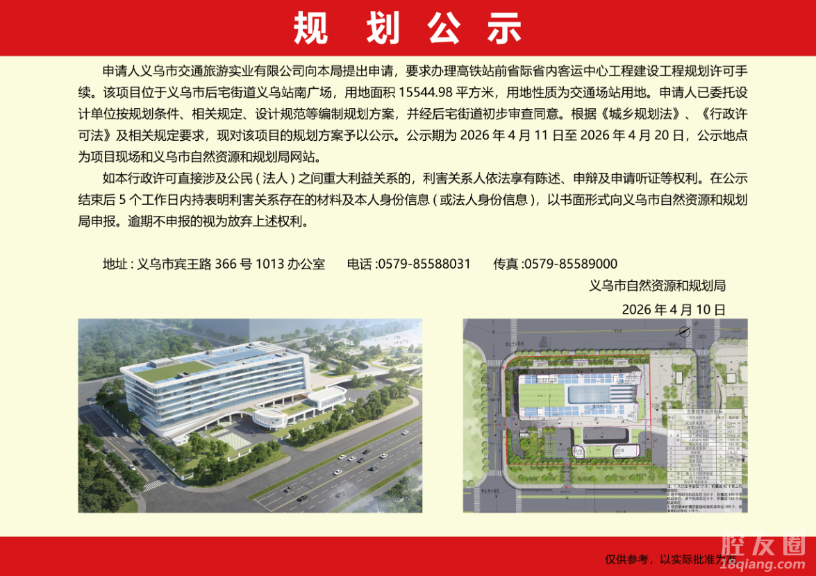 根據(jù)《城鄉(xiāng)規(guī)劃法》、《行政許可法》及相關(guān)規(guī)定要求,現(xiàn)對該項(xiàng)目的規(guī)劃方案予以公示。公示期為2026年4月11日至2026年4月20日,公示地點(diǎn)為項(xiàng)目現(xiàn)場和義烏市自然資源和規(guī)劃局網(wǎng)站。